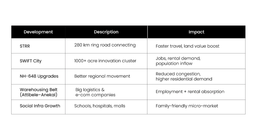 Two major developments are set to reshape the Chikka Tirupathi–Sarjapur belt. The first is the STRR (Satellite Town Ring Road), set to enable seamless connectivity between key towns across the region. The second is SWIFT City, an upcoming technology-led township in Sarjapur. Together, these initiatives are expected to elevate the entire corridor into a high-potential residential destination which will seamlessly connect key towns across the region.