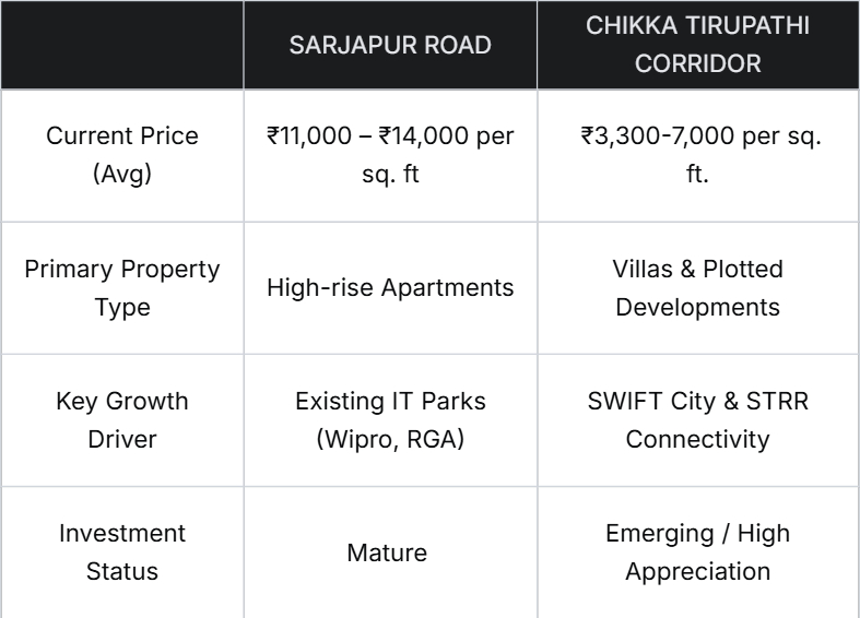 Compared to premium micro-markets such as Sarjapur Road, Bellandur, or Whitefield, the Sarjapur–Chikka Tirupathi stretch offers significantly lower per sq ft prices today.
